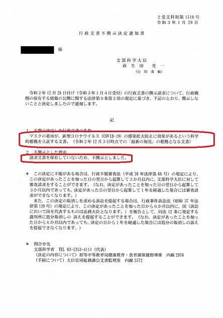 | 文部科学省が「マスクは感染拡大防止の効果があるという科学的根拠を持っていない」という事実です。 |